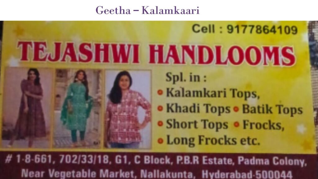 Geetha-Kalamkari DressesBy / October 7, 2025 1 2 3 4 50.000 Handlooms Hyderabad Bookmark Claim Listing Contact Information G1, C Block, PBR Estate, Padma Colony, Nallakunta, Hyderabad, Telangana 500044, India 9177864109 Detailed InformationHandloom kalamkaari and Khadi Tops and Frocks.