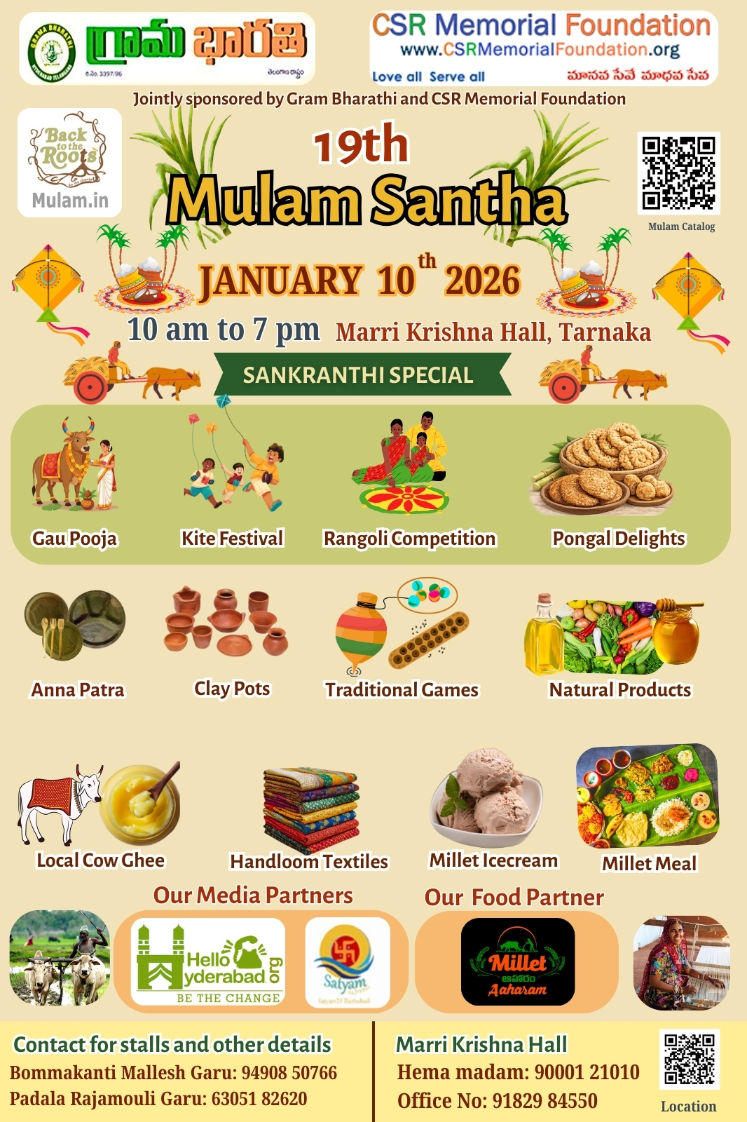 𝐂𝐒𝐑 𝐌𝐞𝐦𝐨𝐫𝐢𝐚𝐥 𝐅𝐨𝐮𝐧𝐝𝐚𝐭𝐢𝐨𝐧 & గ్రామ భారతి సంయుక్త ఆధ్వర్యంలో మన 𝟏8వ మూలం సంత తేదీ: 13 డిసెంబర్ 𝟐𝟎𝟐𝟓 (రెండవ శనివారం) స్థలం:మర్రి కృష్ణా హాల్, తార్నాక సమయం: ఉదయం 𝟏𝟎:𝟎𝟎 నుండి సాయంత్రం 𝟕:𝟎𝟎 వరకు సంత ప్రత్యేకతలు: రైతులు, చేతివృత్తులవారు, ఖాదీ వృత్తిదారులు, మిల్లెట్ ఉత్పత్తిదారులు మరియు ప్రకృతి ప్రేమికులు — నేరుగా వినియోగదారులతో కలుసుకునే వేదిక! విత్తనాలు , మొక్కలు , గృహోపకరణాలు కొనుగోలు చేసే అవకాశమూ ఉంది. ప్రత్యేక […]