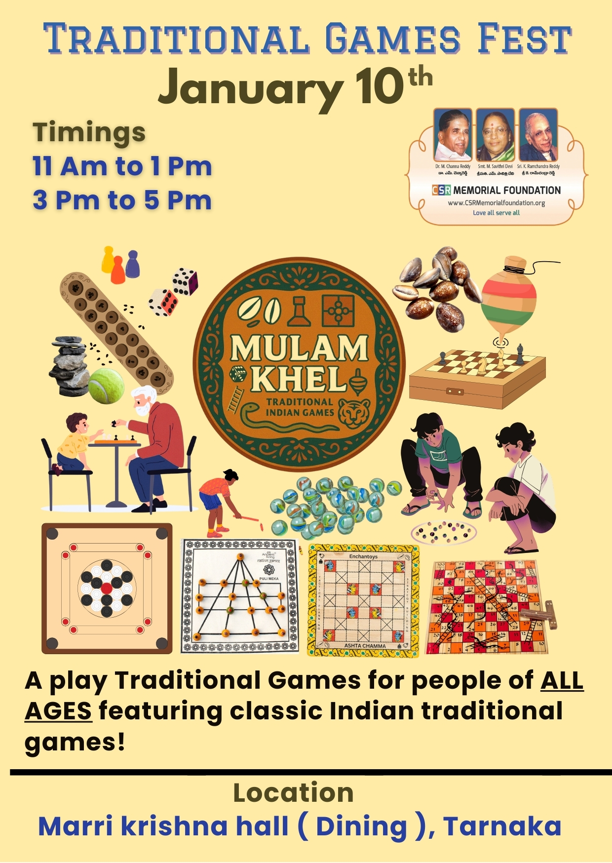 Celebrating India’s Timeless Play Culture Date: January 10, 2025Day: FridayVenue: Marri Krishna Hall (Dining), TarnakaOrganized by: CSR Memorial Foundation🌐 Website: https://www.csrmemorialfoundation.org Event Timings Morning Session: 11:00 AM – 1:00 PM Evening Session: 3:00 PM – 5:00 PM About MULAM KHEL MULAM KHEL – Traditional Indian Games is a joyful celebration of India’s rich heritage of […]