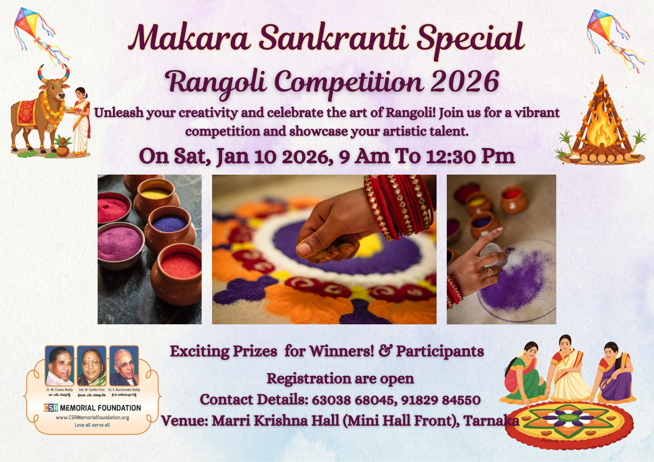 Makara Sankranti sandarbhamga CSR Memorial Foundation aayojinchina Rangoli Competition lo mee kala pratibhani pradarsinchandi. 📌 Event Details Date: Saturday, 10 January 2026 Time: 9:00 AM – 12:30 PM Venue: Marri Krishna Hall (Mini Hall Front), Tarnaka 🎨 Highlights ✅ FREE ENTRY (No Registration Fee) Rangoli kala pratibhaku avakasam Winners & Participants ki exciting prizes Certificates […]