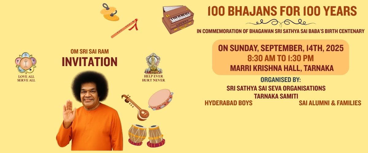 Marri krishna hall , Viayapuri colony , Tarnaka Marri Krishna Hall, Near Dr. M. Channa Reddy garu’s residence & St. Ann ’s High School, Vijayapuri, Vijayapuri Colony, Tarnaka, hyderabad, 500007, India🌸 Om Sri Sai Ram 🌸 100 Bhajans for 100 Years In Commemoration of Bhagawan Sri Sathya Sai Baba’s Birth Centenary Dear Devotees, With immense love and reverence, we invite you to a special Akhanda 100 Bhajan Program in celebration of the Birth Centenary of Bhagawan Sri Sathya Sai Baba. Join us for this soulful […]