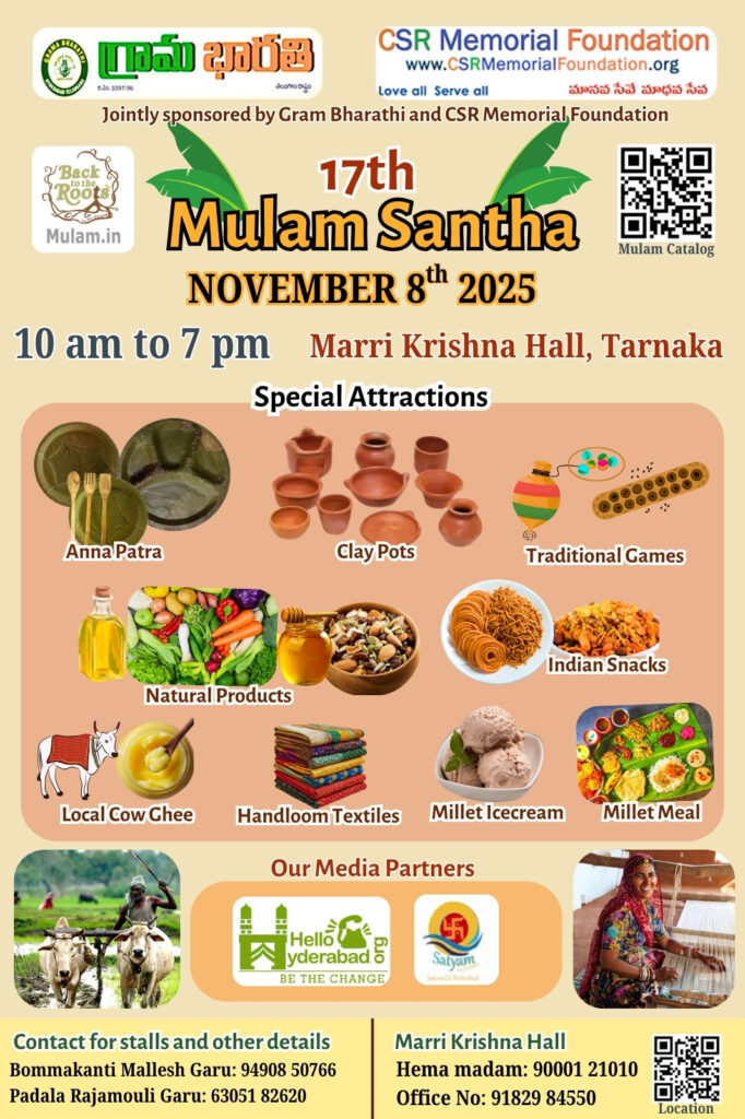𝐂𝐒𝐑 𝐌𝐞𝐦𝐨𝐫𝐢𝐚𝐥 𝐅𝐨𝐮𝐧𝐝𝐚𝐭𝐢𝐨𝐧 & గ్రామ భారతి సంయుక్త ఆధ్వర్యంలో మన 𝟏𝟕వ మూలం సంత తేదీ: 𝟖 నవంబర్ 𝟐𝟎𝟐𝟓 (రెండవ శనివారం) స్థలం: మర్రి కృష్ణా హాల్, తార్నాక సమయం: ఉదయం 𝟏𝟎:𝟎𝟎 నుండి సాయంత్రం 𝟕:𝟎𝟎 వరకు […]